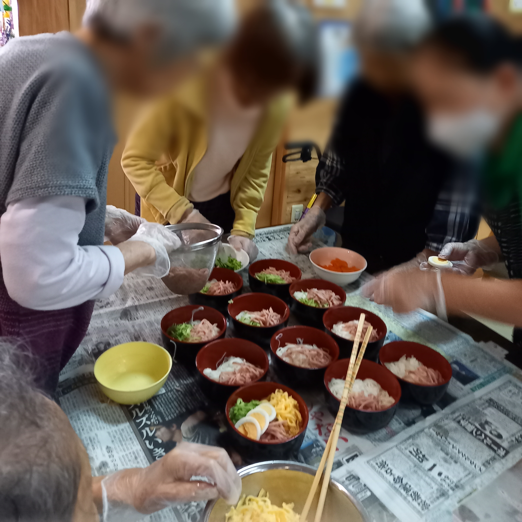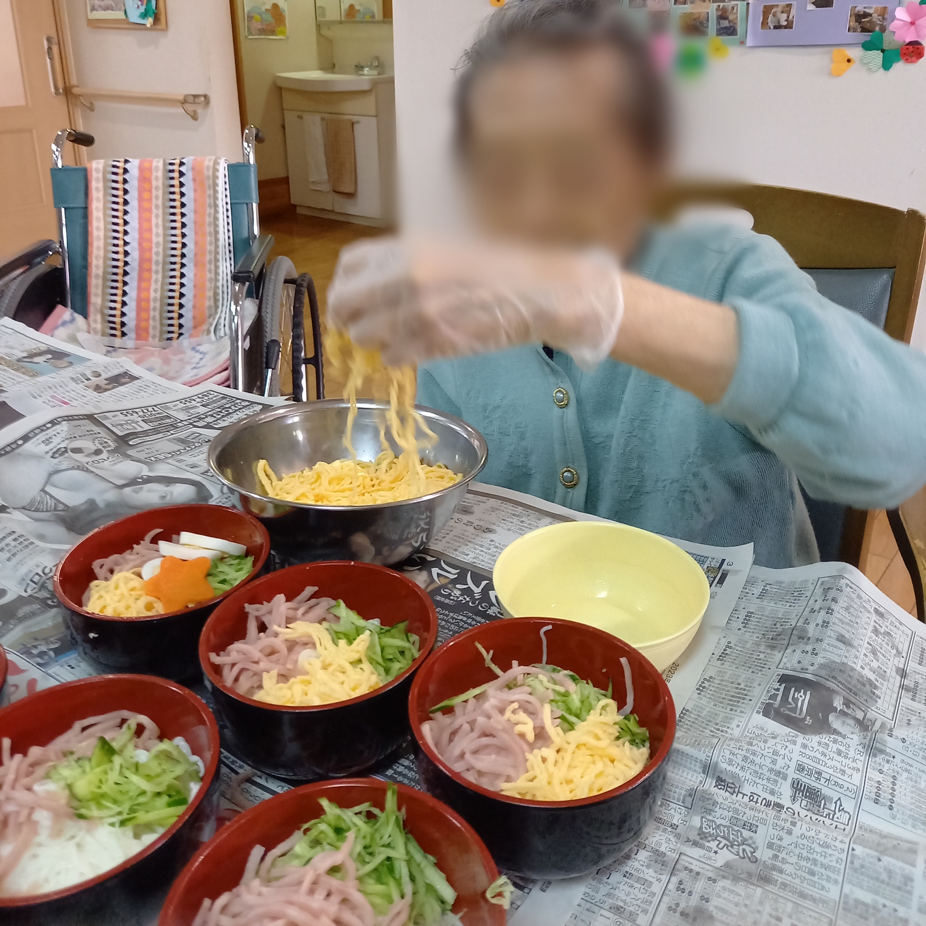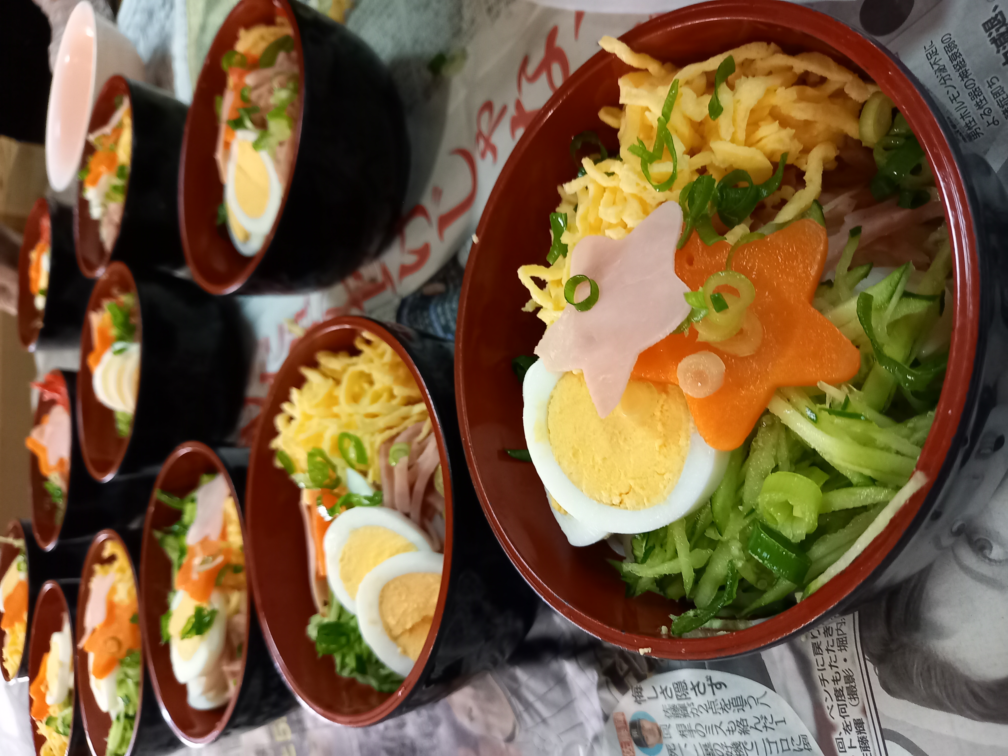 錦糸たまご、細切りハム・きゅうり、ゆで卵・・・と係を決めて盛り付けて頂きました♪